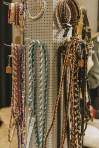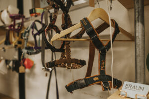 Auf den weiteren 50qm dreht sich alles um Hundezubehör: von hochwertigem Futter und Leckerlies über handgefertigte Leinen und Halsbänder bis hin zu individuell angepassten Maulkörben. Hier befindet sich auch unsere kleine Werkbank, an der viele unserer Produkte entstehen.